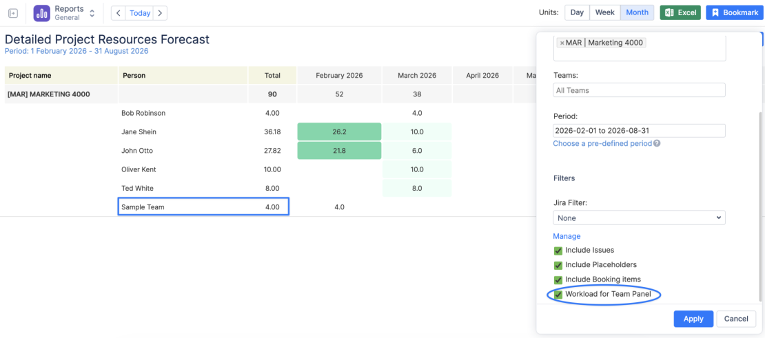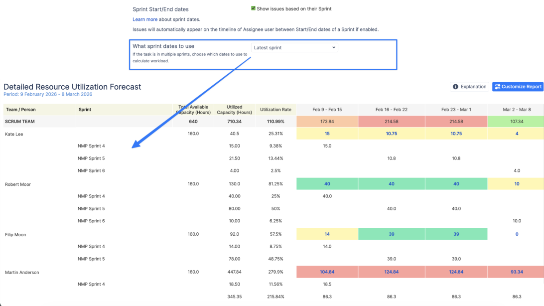 Report Team Utilization se součtovými řádky pro alokované hodiny.